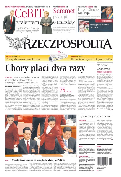 Lekarze wystawiają rachunek za prywatną wizytę pacjentowi, a później NFZ płaci z naszych składek; pozwy zbiorowe z przeszkodami; kto może skorzystać z 50 proc. kosztów; „Poland TalentIT People” – pod takim hasłem chcemy pokazać osiągnięcia technologiczne rodzimego biznesu; Seremet pyta sąd o mandaty; Hugo Chavez nie żyje – populistyczny prezydent sprawujący władzę od ponad 14 lat zmarł na nowotwór.