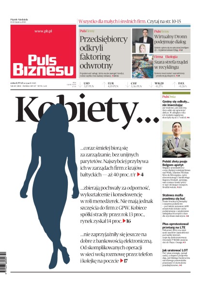 Kobiety coraz śmielej biorą się za zarządzanie, bez unijnych parytetów, najszybciej przybywa ich w zarządach firm z krajów bałtyckich; przedsiębiorcy odkryli faktoring odwrotny – popularność usługi, która może zastąpić kredyt, rośnie szybko bez żadnej reklamy; szara strefa rządzi w recyklingu – system musi zostać uszczelniony, przekonują eksperci; już wiadomo, jak samorządom udało się ograniczyć deficyt.