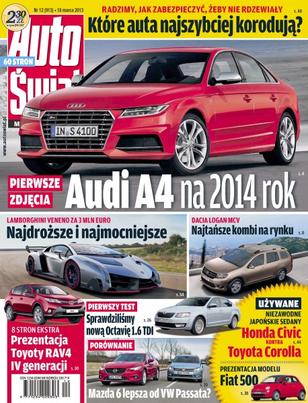 Audi A4 – następna generacja modelu klasy średniej premium z bawarskiego Ingolstadt pojawi się w przyszłym roku; Toyota FT-86 open – pomysł na otwartą wersję sportowego GT86; Lexus IS 300h – japońska limuzyna segmentu premium; Ford Fiesta ST – sportowy wariant małego Forda ze 182-konnym silnikiem turbo; plany Adama Małysza i Roberta Kubicy; Toyota RAV4 – obszerna prezentacja rynkowej nowości w segmencie SUV-ó; Fiat 500 – wszystkie wersje silnikowe; czarna lista korodujących aut – jak je zabezpieczyć.