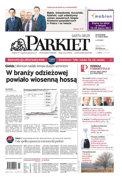 W branży odzieżowej powiało wiosenną hossą – Monnari nadało tempa dużym wzrostom; SII podpowiada drobnym akcjonariuszom, jak skutecznie się bronić gdy spółka opuszcza warszawski parkiet; Białek, Gwiazdowski, Kuczyński, Rybiński, czyli subiektywny zestaw popularnych blogów finansowo-gospodarczych w Polsce i na świecie; w drugim kwartale spółka Czerwona Torebka sfinalizuje zakup sklepu internetowego Merlin – w planach ma jeszcze kilkanaście przejęć; łupkowy boom w USA może poważnie uderzyć w gospodarki wschodzące, takie jak Chiny, Malezja, Brazylia czy Rosja – ostrzegają analitycy Morgan Stanley.