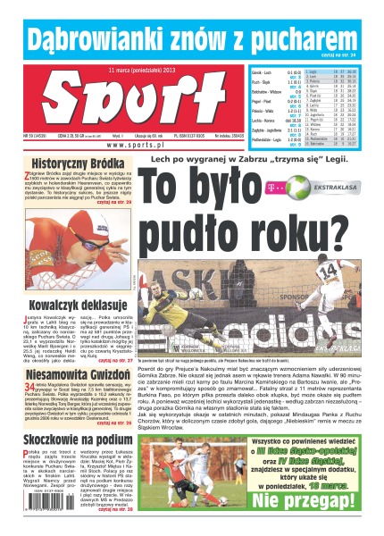 Czy to było pudło roku – Lech po wygranej w Zabrzu „trzyma się” Legii; Dąbrowianki znów z pucharem; Kowalczyk deklasuje – Justyna Kowalczyk wygrała w Lahti bieg na 10 kilometrów techniką klasyczną, zaliczany do narciarskiego Pucharu Świata; niesamowita Gwizdoń – 34-letnia Magdalena Gwizdoń sprawiła sensację, wygrywając w Soczi bieg na 7,5 km biathlonowego Pucharu Świata; skoczkowie na podium – Polska po raz trzeci z rzędu zajęła trzecie miejsce w drużynowym konkursie Pucharu Świata w skokach narciarskich w fińskim Lahti.