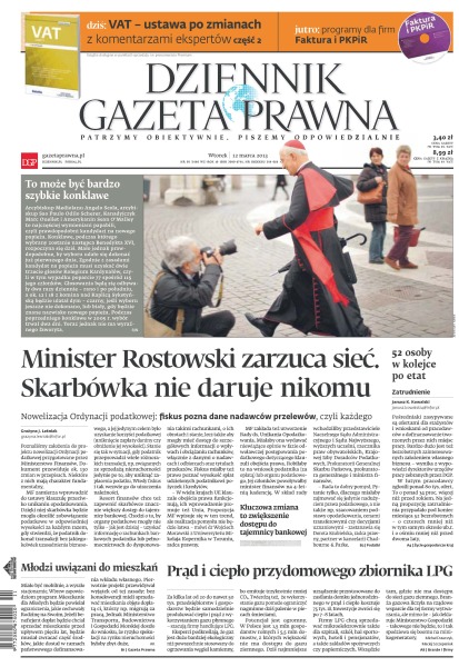 Minister Rostowski zarzuca sieć – skarbówka nie daruje nikomu – nowelizacja Ordynacji podatkowej: fiskus pozna dane nadawców przelewów, czyli każdego; młodzi uwiązani do mieszkań – wbrew zapowiedziom program Mieszkanie dla Młodych będzie powielał ograniczenia, jakie cechowały Rodzinę na Swoim; prąd i ciepło przydomowego zbiornika LPG – za kilka lat od 20 do nawet 50 tysięcy przedsiębiorstw i gospodarstw będzie samodzielnie produkować ciepło i prąd z wykorzystaniem gazu płynnego; 52 osoby w kolejce po etat – pośredniaki zasypywane są ofertami dla stażystów i wnioskami od pracodawców o dofinansowanie tworzonych przez nich miejsc pracy.