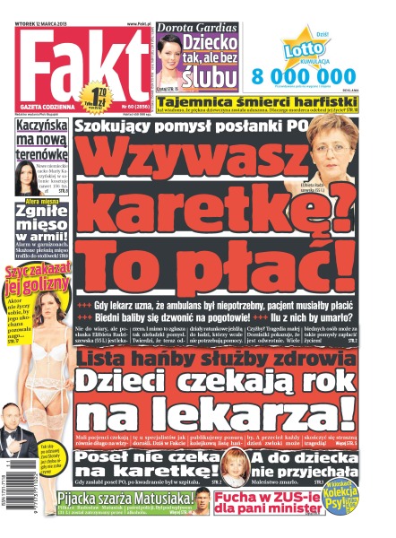 Płać, gdy wzywasz karetkę – szokujący pomysł posłanki PO; dzieci czekają rok na lekarza – lista hańby służby zdrowia; poseł nie czeka na karetkę, a do dziecka nie przyjechała; fucha w ZUS-ie dla pani minister; pijacka szarża Matusiaka – piłkarz Radosław Matusiak został zatrzymany przez patrol policji – był pod wpływem alkoholu; Szyc zakazał jej golizny – aktor nie życzy sobie, by jego ukochana, Zosia Ślotała, pozowała nago; zgniłe mięso w armii – alarm w garnizonach – skażone pleśnią mięso trafiło do stołówek; Kaczyńska ma nową terenówkę – nowe niemieckie cacko Marty Kaczyńskiej w salonie kosztuje nawet 156 tysięcy zł.