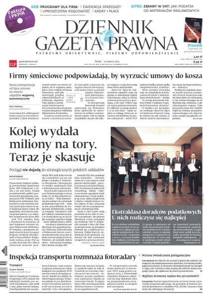 Kolej wydała miliony na tory, teraz je skasuje – pociągi nie dojadą do strategicznych polskich zakładów; ekstraklasa doradców podatkowych – u nich rozliczysz się najlepiej – VII ranking firm i doradców podatkowych; Inspekcja transportu rozmnaża fotoradary – Główny Inspektorat Transportu Drogowego (GITD) jeszcze nie zakończył montażu 300 nowych fotoradarów, a już myśli o tym, gdzie stawiać kolejne; wyższe świadczenia pielęgnacyjne – 820 złotych ma wynosić wsparcie dla rodziców zajmujących się niepełnosprawnym dzieckiem; firmy śmieciowe podpowiadają, by wyrzucić umowy do kosza – nowa interpretacja: od lipca umowy na wywóz odpadów wygasną automatycznie.