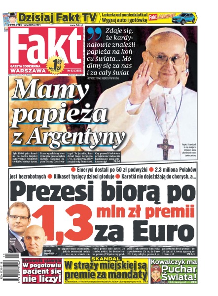 Mamy papieża z Argentyny – była 19:06, gdy z komina na dachu Kaplicy Sykstyńskiej wydobyły się kłęby białego dymu; prezesi biorą po 1,3 mln zł premii za Euro – to gigantyczne pieniądze, których normalni ludzie nie są w stanie zarobić przez całe życie; ratownik ujawnia – w pogotowiu pacjent się nie liczy; skandal, w straży miejskiej są premie za mandaty – komendant z Włocławka nagradza strażników, którzy ukarzą najwięcej osób; Justyna Kowalczyk ma Puchar Świata już po raz czwarty; Aleksander Kwaśniewski boi się podsłuchu – były prezydent naradzał się z Ryszardem Kaliszem, krążąc autem po mieście.