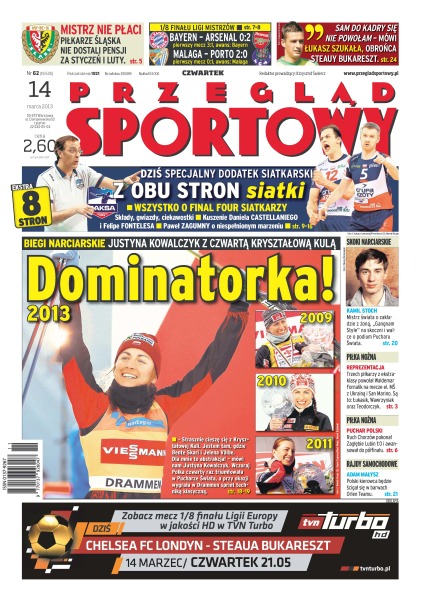 Dominatorka – Justyna Kowalczyk z czwartą Kryształową Kulą; mistrz nie płaci – piłkarze Śląska nie dostali pensji za styczeń i luty; Kamil Stoch – mistrz świata o zakładzie z żoną, „Gangnam Style” na skoczni i walce o podium Pucharu Świata; trzech piłkarzy z ekstraklasy powołał Waldemar Fornalik na mecze eliminacyjne MŚ z Ukrainą i San Marino – są to Łukasik, Wawrzyniak oraz Teodorczyk; Ruch Chorzów pokonał Zagłębie Lubin 1-0 i awansował do półfinału Pucharu Polski; Adam Małysz będzie ścigał się w barwach Orlen Teamu.