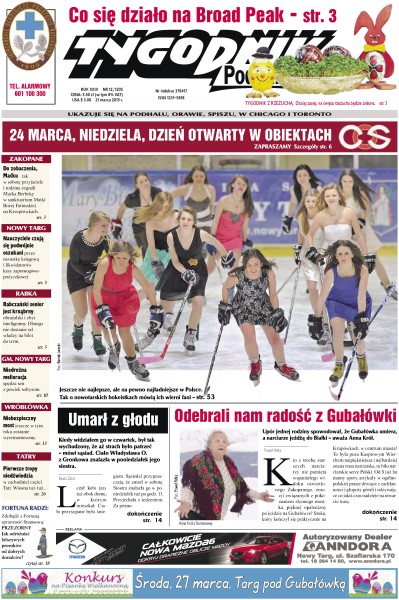 Odebrali nam radość z Gubałówki – upór jednej rodziny spowodował, że Gubałówka umiera, a narciarze jeżdżą do Białki; umarł z głodu – ciało Władysława O. z Gronkowa znalazła w poniedziałek jego siostra; pierwsze tropy niedźwiedzia w zachodniej części Tatr – wiosna tuż-tuż; niebezpieczny most we Wróblówce jeszcze w tym roku zostanie wyremontowany; niedrożna melioracja spędza sen z powiek sołtysom w gminie Nowy Targ; rabczański senior jest krnąbrny, obrażalski i zbyt inteligentny – dlatego nie dostanie od władzy na bilet do term; nauczyciele czują się podwójnie oszukani przez oszustkę księgową i likwidatorów kasy zapomogowo-pożyczkowej; „Do zobaczenia, Maćku” - tak w sobotę przyjaciele i rodzina żegnali Maćka Berbekę w sanktuarium Matki Bożej Fatimskiej na Krzeptówkach.