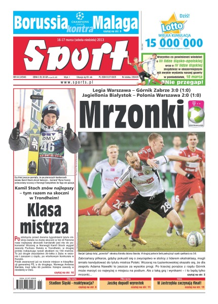 Mrzonki – Legia Warszawa pokonała Górnik Zabrze 3-0, a Jagiellonia Białystok Polonię Warszawa 2-0; klasa mistrza – Kamil Stoch znów najlepszy – tym razem na skoczni w Trondheim; Stadion Śląski ma być dokończony zgodnie z pierwotnym planem – potrzeba na to przynajmniej 121 milionów złotych; z podbitym okiem – Bayern jedzie na BayArena, by wziąć rewanż za przegraną w rundzie jesiennej; debiutant dla Polaków – nasz tercet z Dortmundu zagra z Malagą; chcą zostać „czarnym koniem” – w poniedziałek w Jekaterynburgu rusza decydująca batalia o zwycięstwo w Eurolidze z udziałem CCC Polkowice.