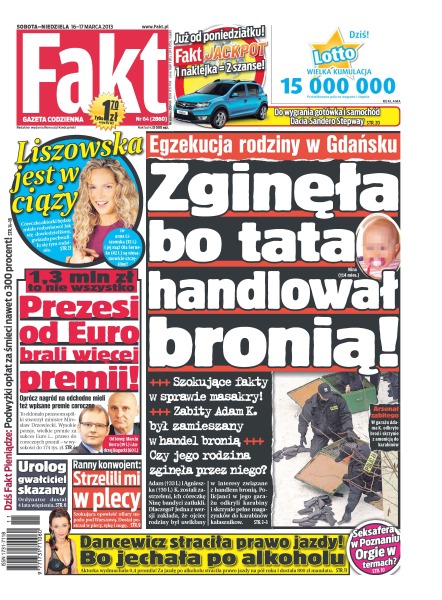 Zginęła bo tata handlował bronią – egzekucja rodziny w Gdańsku – zabity Adam K. był zamieszany w handel bronią; Dancewicz straciła prawo jazdy, bo jechała po alkoholu – aktorka wydmuchała 0,4 promila; Joanna Liszowska jest w ciąży – córeczka aktorki będzie miała rodzeństwo; 1,3 miliona złotych to nie wszystko – prezesi od Euro brali więcej premii; „Strzelili mi w plecy” – szokująca opowieść ofiary napadu pod Warszawą; seksafera w Poznaniu – orgie w termach; urolog-gwałciciel skazany – ordynator dostał 4 lata więzienia.