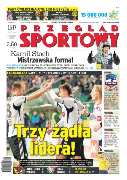 Trzy żądła lidera – Legia Warszawa z łatwością wypunktowała rewelację rundy jesiennej; Kamil Stoch i jego mistrzowska forma – Polak wygrał po raz drugi w tym sezonie zawody Pucharu Świata – po triumfie w Trondheim awansował na trzecie miejsce w klasyfikacji generalnej; tylko u nas – sędzia Sławomir Redziński po latach o skandalicznych okolicznościach meczu Legia – Górnik z 1994 roku; Robert Lewandowski może w sobotę strzelić gola w ósmym z rzędu meczu w Bundeslidze – jeśli tego dokona, ustanowi rekord Borussii Dortmund; w niedzielę Vive Kielce zagra na wyjeździe pierwszy mecz 1/8 finału Ligi Mistrzów z węgierskim Pickiem Szeged.