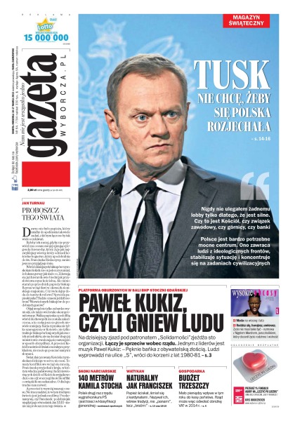 Donald Tusk nie chce, żeby Polska się rozjechała; Paweł Kukiz, czyli gniew ludu – Platforma Oburzonych w sali BHP Stoczni Gdańskiej; 140 metrów Kamila Stocha – Polak drugi raz z rzędu wygrał konkurs PŚ i jest trzeci w klasyfikacji generalnej; naturalny jak Franciszek – papież ściskał, śmiał się z kardynałami, nazywał ich, wbrew tradycji, nie „panami”, lecz „braćmi”; budżet trzeszczy – mało pieniędzy wpływa w tym roku do kasy państwa, rząd może więc odwołać obniżkę VAT w 2014 roku; proboszcz tego świata – dawno nie było papieża, który miałby do spełnienia tak wiele zadań, z którym łączono by tak wiele oczekiwań.