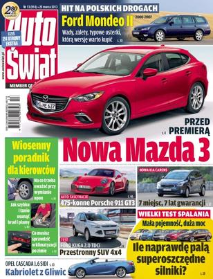 Mazda 3 – kolejna odsłona japońskiego auta kompaktowego; Peugeot 308 – nowe wydanie francuskiego kompaktu; Mercedes CLA – stylowy 4-drzwiowy model na bazie klasy A; Opel Cascada – wrażenia z jazd pięknym kabrioletem wyprodukowanym w Polsce; Kia Carens nowe oblicze kompaktowego vana koreańskiej marki; Ford Kuga – druga generacja fordowskiego SUV-a z dieslem 2.0 TDCI; wymiana opon na letnie – ile można zaoszczędzić na oponach w alternatywnym rozmiarze; czyszczenie i pielęgnacja auta – na co zwrócić uwagę i jakich preparatów użyć; serwis klimatyzacji – przygotowanie klimy do sezonu wiosenno-letniego; Porsche 911 GT3 – supersportowiec na 50 urodziny kultowej „911-ki”.