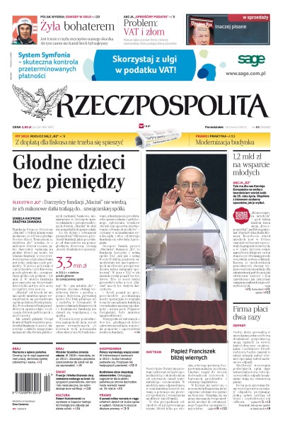 Miliony złotych, jakie płyną od darczyńców dla Fundacji „Maciuś”, w rzeczywistości konsumuje pośrednik; PSL chce, by obywatelski projekt ustawy o małych sądach wszedł pod obrady Sejmu w tym tygodniu; w lipcu zmienią się przepisy dotyczące odbierania odpadów; nowy papież zaskakuje bezpośredniością i odchodzeniem od sztywnych norm watykańskiego ceremoniału; Francja i Wielka Brytania są coraz bliższe decyzji o dostarczaniu broni dla syryjskich sił powstańczych; Robert Kuśmirowski przekonuje w Sopocie, że sztukę od nauki dzieli bardzo subtelna granica; dwie bramki i asysta Roberta Lewandowskiego; Piotr Żyła nigdy wcześniej nie stał na podium Pucharu Świata – w Oslo wygrał razem z Gregorem Schlierenzauerem.