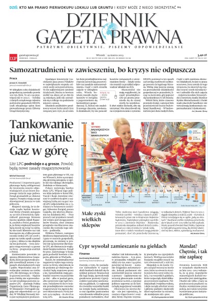 Kto ma prawo pierwokupu lokalu lub gruntu i kiedy może z niego skorzystać; w ubiegłym roku działalność gospodarczą zawiesiło prawie 100 tys. firm – to aż o 59 proc. więcej niż w 2011 r.; producenci i importerzy gazu płynnego będą zobligowani do tworzenia rezerw odpowiadających aż 90 dniom krajowego zużycia tego paliwa; tylko nieliczne sieci handlowe osiągają wysokie zarobki – wynika z danych publikowanych przez nie w Krajowym Rejestrze Sądowym; decyzja o tym, by posiadacze rachunków w cypryjskich bankach dołożyli się do unijnej pomocy finansowej dla tego kraju, spowodowała gwałtowne protesty Cypryjczyków i poważne zawirowania na giełdach; ostatnia kontrola NIK w urzędach skarbowych za lata 2011–2012 wykazała, że 25 proc. mandatów stanowiących dochód wojewodów jest nieściągalne.