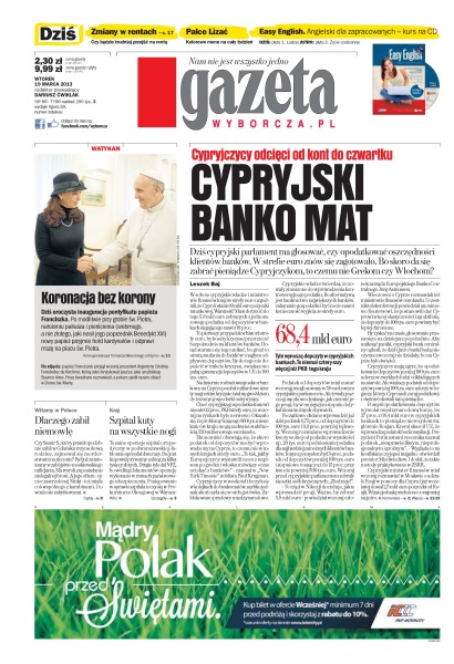 Dziś cypryjski parlament ma głosować, czy opodatkować oszczędności klientów banków; Niemcy przekazali Polsce podejrzanego o zabójstwo sprzed blisko 20 lat, ale być może trzeba będzie go wypuścić, bo przez ten czas w CBŚ zaginęły dowody zbrodni; czy Samir S., który prawdopodobnie zabił w Gdańsku trzyosobową rodzinę, zajmował się dotąd morderstwami na zlecenie; papież Franciszek zainauguruje dziś uroczyście swój pontyfikat; dziesiąta rocznica inwazji na Irak stała się w USA okazją do ponurych podsumowań; komu ZUS przyzna rentę; czy budżet państwa może się zawalić pod ciężarem dopłat do emerytur minimalnych; w Polsce zaledwie 2 proc. ogółu ładunków dostarczane jest tzw. transportem intermodalnym – to 15 razy mniej niż we Włoszech, w Hiszpanii czy Holandii; dlaczego po dwóch latach prokuratura chce umorzyć śledztwo w sprawie śmierci Jolanty Brzeskiej.