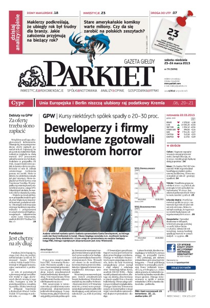 Deweloperzy i firmy budowlane zgotowali inwestorom horror; PBG z rekordową stratą w historii giełdy; PBG z rekordową stratą w historii giełdy; przedstawiciele branży telekomunikacyjnej sypnęli informacjami w raportach; los Cypru wisi na włosku; UTP zacznie działać na warszawskiej giełdzie już 15 kwietnia, niosąc ze sobą nie tylko nowoczesne rozwiązania technologiczne; ubiegłoroczni debiutanci za przeprowadzone oferty zapłacili w sumie ponad 58 mln zł.; zyski TFI spadały kolejny rok – część firma problemy z rentownością; biznes brokerski staje się coraz mniej dochodowy; trzy długofalowe wnioski płynące z analizy najnowszych wyników spółek; Bruksela i Berlin niszczą