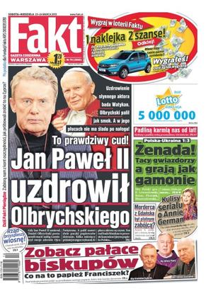 Uzdrowienie słynnego aktora bada Watykan – Olbrychski palił jak smok, a w jego płucach nie ma śladu po nałogu; tajemnica odejścia Benedykta XVI – czy papież Franciszek ją ujawni; szokujące kulisy przestępczego procederu – padlina mogła trafiać do dużych zakładów mięsnych, gdzie była przerabiana na wędliny, które dostarczano do sklepów; Samir S. miał pistolet z tłumikiem, a nocami znikał z domu na tygodnie – czy wykonywał mafijne wyroki; rewolucja w zleceniach, ZUS tylko od niskich zarobków; nie miejmy złudzeń – nasi piłkarze nie wywalczą niestety awansu na brazylijski mundial – z Ukrainą przegrali 1:3; Maciej Szczęsny za słabszą formę syna obwinił menedżera Arsenalu; Niemcy oskarżają polskich bohaterów.