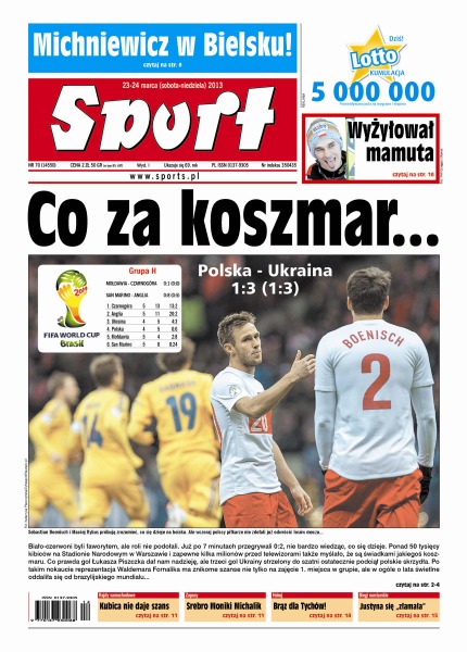 Biało-czerwoni byli faworytem, ale roli nie podołali – już po 7 minutach przegrywali 0:2, a mecz zakończył się wynikiem 1:3 – ponad 50 tysięcy kibiców na Stadionie Narodowym w Warszawie i zapewne kilka milionów przed telewizorami także myślało, że są świadkami jakiegoś koszmaru; sensacyjny remis Hiszpanii z Finlandią; Monika Michalik zdobyła w Tbilisi srebrny medal mistrzostw Europy w kategorii 63 kg; mimo wcześniejszych gróźb, Justyna Kowalczyk ostatecznie wystartowała w Falun – w prologu Polka była dopiero piąta, wygrała Marit Bjoergen; Piotr Żyła latał wczoraj w Planicy pięknie i daleko – w czwartym z rzędu konkursie na podium nie zabrakło polskiego akcentu.