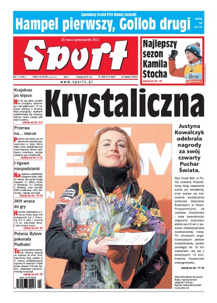 Przyczyny i skutki porażki polskich piłkarzy w meczu z Ukrainą; Justyna Kowalczyk odebrała nagrody za swój czwarty Puchar Świata; hokeiści Jastrzębia w 4. meczu finału play offu przegrywali już z Cracovią 0-3 w serii i wczoraj 1-3 w pierwszej tercji – dziś kolejny mecz; główny faworyt awansu do PLH, Podhale Nowy Tar zostało ograne na własnym lodzie przez Bisset Polonię Bytom.