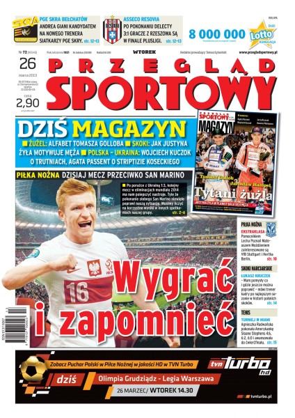 Dziś w meczu piłki nożnej z San Marino Polacy zapewne zdobędą trzy punkty – tylko czy to coś zmieni; VfB Stuttgart i Hertha Berlin zainteresowane są pomocnikiem Lecha Poznań, Mateuszem Możdżeniem; Łukasz Kruczek, trener skoczków, podsumowuje najlepszy sezon w historii polskich skoków; Agnieszka Radwańska awansowała do ćwierćfinału turnieju w Miami.