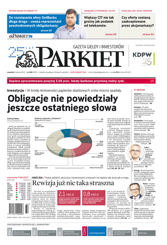 Największy w Polsce newsroom gospodarczy zbiera, analizuje i zgłębia dla Państwa najważniejsze informacje ze świata finansów. Codzienne wydanie „Parkietu”, sześć dni w tygodniu, to kilkadziesiąt artykułów o emitentach, instytucjach finansowych, gospodarce. To również opinie, felietony i wywiady z najważniejszymi ludźmi krajowej i globalnej finansjery.