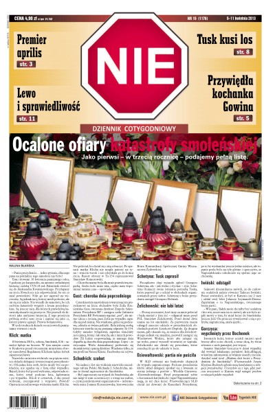 Ocalone ofiary katastrofy smoleńskiej – jako pierwsi – w trzecią rocznicę – podajemy pełną listę; premier aprilis – Tusk zapowiedział przeciwko nam kroki prawne – czyżby premier objął tekę w Ministerstwa Głupich Kroków; przywiędła kochanka Gowina – romans ministra sprawiedliwości z Temidą to związek partnerski jałowy, bo skazany na bezpłodność; szmer wyższych sfer – szkoła wyższa minister Kudryckiej idzie na przemiał; Tusk kusi los – aby uzasadnić marnotrawstwo, państwo szuka seksoholików; ćwierkający w Panu – polscy jezuici zorganizowali pierwsze na świecie rekolekcje na Twitterze.