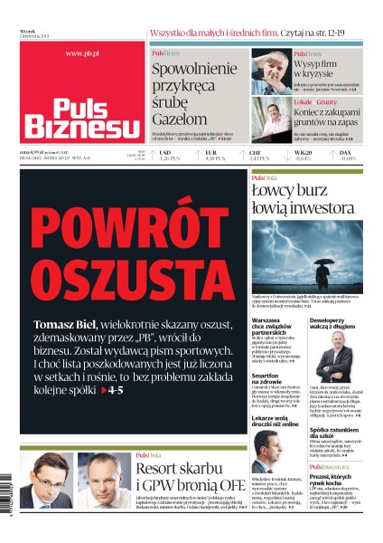 Przedsiębiorcy przeżywają najtrudniejszy okres od trzech lat — wynika z badania „PB”; wysyp firm w kryzysie – jednym z powodów jest samozatrudnienie; koniec z zakupami gruntów na zapas; Tomasz Biel, wielokrotnie skazany oszust, zdemaskowany przez „PB”, wrócił do biznesu; Warszawa chce związków partnerskich; lekarze wolą druczki niż online; resort skarbu i GPW bronią OFE.