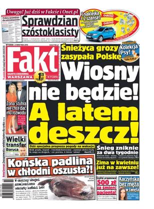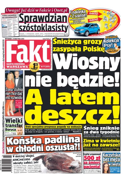 Sprawdzian szóstoklasisty – pytania i rozwiązania zadań wraz z dokładnym omówieniem; śnieżyca grozy zasypała Polskę – wiosny nie będzie; żona Stuhra nie chce dać mu rozwodu; wielki transfer Boruca – może bronić w Evertonie; końska padlina w chłodni oszusta; szpital proponował 500 zł za śmierć pacjenta.