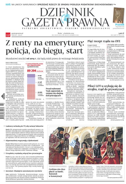 Mundurowi renciści od 2014 r. nie będą mieli prawa do wyższego świadczenia; pięć recept rządu na OFE; piloci LOT-u szykują się do strajku, rząd do prywatyzacji; ludowcy wchodzą do TV, aby uciszyć lektorów; hipermarkety wygrywają z dyskontami; urzędnicy wydadzą więcej bez przetargów; Seremet: zbadajcie automatyzm wyroków.