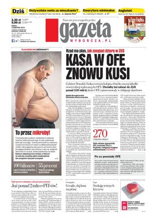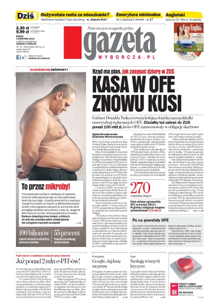 Gabinet Donalda Tuska rozważa kolejną obniżkę naszej składki emerytalnej wpłacanej do OFE, chciałby też zabrać do ZUS ponad 100 mld zł; dożywotnia renta za mieszkanie – na czym to polega; emerytura minimalna – ile z najniższych składek; flora bakteryjna w jelitach, niezbędna do trawienia,może być także przyczyną tego, że cały cywilizowany świat tyje na potęgę; padł rekord w składaniu rozliczeń przez internet – już ponad 2 mln e-PIT-ów.