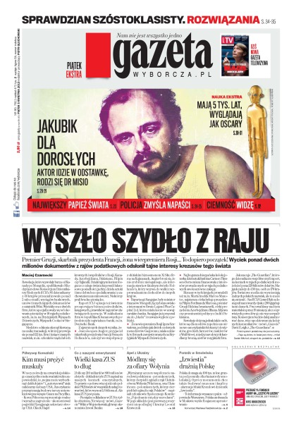 Premier Gruzji, skarbnik prezydenta Francji, żona wicepremiera Rosji... wyciek ponad dwóch milionów dokumentów z rajów podatkowych odsłonił tajne interesy krezusów tego świata;sprawdzian szóstoklasisty – rozwiązania; dlaczego Kim musi prężyć muskuły; ZUS – co z naszymi emeryturami; „Izwiestia”drażnią Polskę.