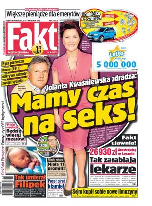Była pierwsza dama Jolanta Kwaśniewska (58 l.) odkrywa sekrety swojej sypialni; w lidze piłkarskiej rewolucja – od nowego sezonu będzie aż 7 nowych kolejek; wielka klapa Zamachowskiego; pijacki rekord – miała 11 promili; 26930 zł, anestezjolog w Lesznie – tak zarabiają lekarze.