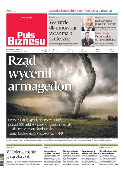 Rząd wycenił armagedon – przez 20 lat gospodarka może stracić ponad 200 mld zł z powodu zmian klimatu — alarmuje resort środowiska – taniej będzie się przystosować; w Orlenie rośnie gorączka złota – związkowcy, choć zarabiają znacznie więcej od średniej, żądają podwyżek, bo spółka ma dobre wyniki; Ursusa ciągnie do miast i komórek – ciągniki jeszcze długo będą najmocniejszą biznesową nogą legendarnej firmy PRL; Enter Air zacznie w Niemczech od zera – polska prywatna linia czarterowa nie zaryzykowała przejęcia upadłego XL Airways Germany; wsparcie dla innowacji wciąż mało skuteczne – Polska jest na szarym końcu europejskich rankingów innowacyjności.