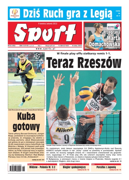 Teraz Rzeszów – w finale play offu siatkarzy remis 1-1; Kuba gotowy – trener piłkarzy Borussii Dortmund, Juergen Klopp, powiedział na wczorajszej konferencji prasowej, że zmagający się ostatnio z kontuzją pachwiny Jakub Błaszczykowski jest gotowy do gry w dzisiejszym rewanżowym meczu ćwierćfinału Ligi Mistrzów z Malagą; przegrana Marta Domachowska – nie pomógł doping katowickiej publiczności – jedna z dwóch Polek w BNP Paribas Katowice Open już poza turniejem; plan wykonany w połowie – Mistrzostwa Europy w Tiranie – gdyby wczoraj mogła wystartować Marzena Karpińska cieszylibyśmy się ze złotego medalu.