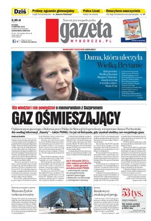 Gaz ośmieszający – kto wiedział i nie powiedział o memorandum z Gazpromem – o planowanym gazociągu z Białorusi przez Polskę do Słowacji był uprzedzony wicepremier Janusz Piechociński; dama, która uleczyła Wielką Brytanię – była premier Wielkiej Brytanii Margaret Thatcher zmarła wczoraj w wyniku udaru – miała 87 lat; emerytura nauczyciela – dla kogo świadczenie kompensacyjne; Muzeum Żydów czeka na rocznicę – obchody powstania w getcie; Janukowycz zwalnia pod presją – jeśli Europa i USA będą konsekwentnie naciskać, prezydent Wiktor Janukowycz ustąpi i zwróci wolność także b. premier Julii Tymoszenko.