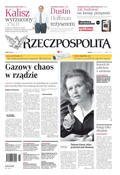 Gazowy chaos w rządzie – premier i wicepremier nie konsultują się w sprawie kluczowej dla Polski; Ryszard Kalisz wyrzucony z SLD – popularny polityk lewicy został wykluczony z Sojuszu za działanie na rzecz konkurencyjnej formacji politycznej; Dustin Hoffman reżyserem – słynny aktor w wieku 75 lat stanął po drugiej stronie kamery – przeniósł na ekran sztukę Ronalda Harwooda „Kwartet”; jak budować, nie łamiąc przepisów; jak udokumentować wsparcie dla Kościoła; Żelazna Dama, która przechytrzyła Moskwę – po wielu miesiącach choroby Margaret Thatcher zmarła wczoraj w Londynie na atak serca; stopa bezrobocia w porównaniu z lutym spadła o 0,1 pkt proc. i wyniosła w marcu 14,3 proc. – liczba osób bez pracy zmniejszyła się o ok. 20 tysięcy.