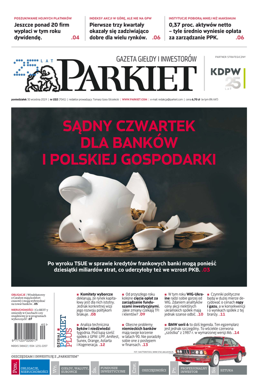 Największy w Polsce newsroom gospodarczy zbiera, analizuje i zgłębia dla Państwa najważniejsze informacje ze świata finansów. Codzienne wydanie „Parkietu”, sześć dni w tygodniu, to kilkadziesiąt artykułów o emitentach, instytucjach finansowych, gospodarce. To również opinie, felietony i wywiady z najważniejszymi ludźmi krajowej i globalnej finansjery.