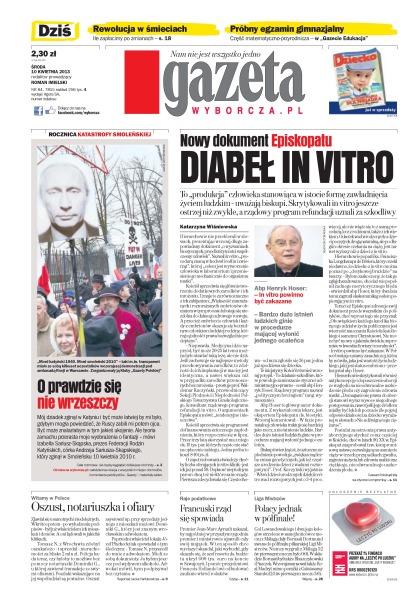 Diabeł in vitro – nowy dokument Episkopatu – to „produkcja” człowieka stanowiąca w istocie formę zawładnięcia życiem ludzkim – uważają biskupi; o prawdzie się nie wrzeszczy – rocznica katastrofy smoleńskiej; rewolucja w śmieciach – ile zapłacimy po zmianach; oszust, notariuszka i ofiary – zjawiał się u samotnych i niedołężnych – wkrótce potem – po wyłudzeniu podpisów – był już właścicielem ich mieszkań i domów; francuski rząd się spowiada – premier Jean-Marc Ayrault nakazał, by najpóźniej w przyszłym tygodniu premier i ministrowie ujawnili cały swój majątek; Liga Mistrzów – Polacy jednak w półfinale – gol Lewandowskiego i dwa jego kolegów strzelone w samej końcówce meczu z Málagą dały Borussii Dortmund awans do półfinału piłkarskiej Ligi Mistrzów.