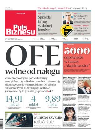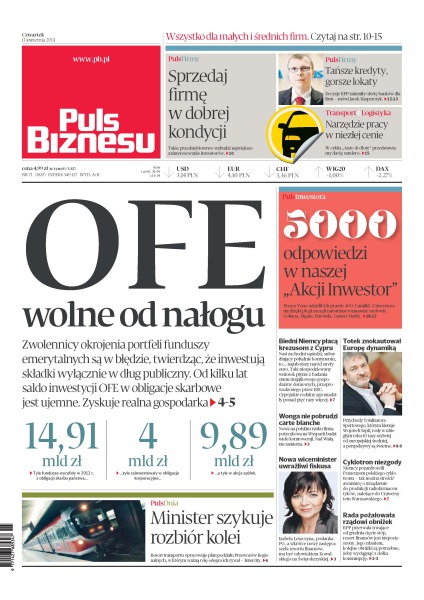 OFE wolne od nałogu – zwolennicy okrojenia portfeli funduszy emerytalnych są w błędzie, twierdząc, że inwestują składki wyłącznie w dług publiczny – od kilku lat saldo inwestycji OFE w obligacje skarbowe jest ujemne – zyskuje realna gospodarka; sprzedaj firmę w dobrej kondycji – takie przedsiębiorstwo wzbudzi największe zainteresowanie inwestorów; minister szykuje rozbiór kolei – resort transportu opracowuje plan podziału Przewozów Regionalnych, w którym ważną rolę odegra ich rywal — Intercity; biedni Niemcy płacą krezusom z Cypru – nasi zachodni sąsiedzi, subsydiujący południe kontynentu, to najuboższy naród strefy euro; Wonga nie pobrudzi carte blanche – nowa na polskim rynku firma pożyczkowa na Wyspach budzi wiele kontrowersji – nad Wisłą nie zamierza.