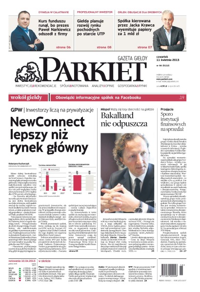NewConnect lepszy niż rynek główny – inwestorzy liczą na prywatyzacje; dymisja w Calatravie – kurs funduszu runął, bo prezes Paweł Narkiewicz odszedł z firmy; giełda planuje rozwój rynku pochodnych po starcie UTP; Orlen, obligacje dla drobnych – spółka kierowana przez Jacka Krawca wyemituje papiery za 1 mld zł; obowiązki informacyjne spółek na Facebooku; Bakalland nie odpuszcza – ważą się losy obecności na giełdzie; sporo instytucji finansowych na sprzedaż – największa skandynawska grupa Nordea Bank Sweden AB planuje się wycofać z działalności w Polsce; związki zawodowe żądają podwyżek wynagrodzeń nie tylko w państwowych przedsiębiorstwach.