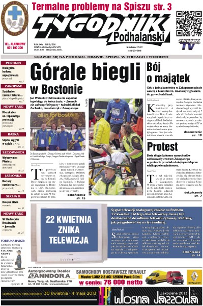 tego biegu do końca życia; Poronin – nielegalna budowa napiętnowana przez sąd; Zakopane – szubienice zamiast latarni na placu Niepodległości; Nowy Targ – mieszkańcy os. Topolowego protestują przeciwko parkingom; Rabka – szpital wygrał w sądzie z NFZ; Szczawnica – wybory miss Pienin za zamkniętymi drzwiami; Jabłonka – bociany zamieszkały tuż przy szkole; Sucha Beskidzka – kolejna bitwa o zamek; sygnał telewizji analogowej zniknie na Podhalu 22 kwietnia; protest – dwie długie kolumny samochodów zablokowały centrum Zakopanego w proteście przeciwko kolejnym sklepom wielkopowierzchniowym; bój o majątek – gdy o jedną kamienicę w Zakopanem górale walczą z burmistrzem, lokatorzy z góralami, do gry wchodzi bank.