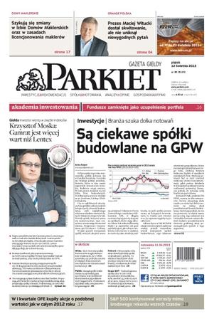 Są ciekawe spółki budowlane na GPW – branża szuka dołka notowań; „Gamrat jest więcej wart niż Lentex” – Krzysztof Moska – inwestor wierzy w zwyżki indeksów; w I kwartale OFE kupiły akcje o podobnej wartości jak w całym 2012 roku; S&P 500 kontynuował wzrosty mimo środowego rekordu wszech czasów; szykują się zmiany w Izbie Domów Maklerskich oraz w zasadach licencjonowania maklerów; Orange Polska – prezes Maciej Witucki dostał skwitowanie, ale nie uniknął niewygodnych pytań; fundusze zamknięte jako uzupełnienie portfela; zarząd PGNiG widzi szanse na sprzedaż gazu na Ukrainę oraz możliwość skorzystania z jej podziemnych magazynów.