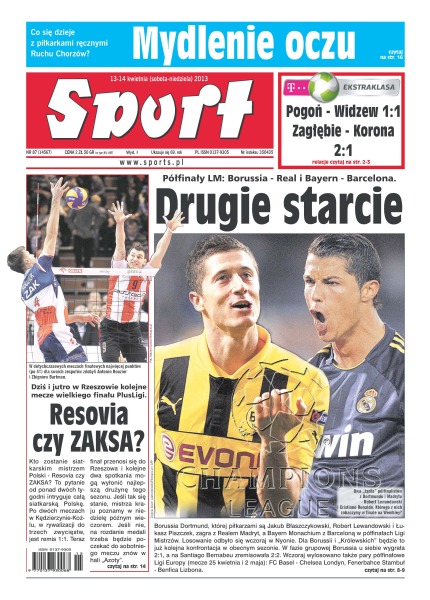 Drugie starcie – Borussia Dortmund zagra z Realem Madryt, a Bayern Monachium z Barceloną w półfinałach Ligi Mistrzów; Resovia czy ZAKSA – dziś i jutro w Rzeszowie kolejne mecze wielkiego finału PlusLigi; mydlenie oczu – co się dzieje z piłkarkami ręcznymi Ruchu Chorzów; zastąpili lidera – dobra gra w jednej kwarcie wystarczyła, aby Stelmet Zielona Góra wywiózł komplet punktów z Gdyni; Pogoń zremisowała z Widzewem 1-1, a Zagłębie pokonało Koronę 2-1.