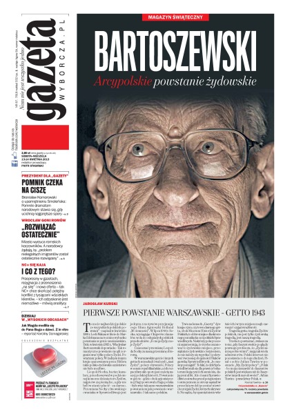 Bartoszewski – arcypolskie powstanie żydowskie – pierwsze Powstanie Warszawskie, getto 1943; pomnik czeka na ciszę – „Pomniki dramatom narodowym stawia się, gdy ucichną najgorętsze spory” – Bronisław Komorowski o upamiętnieniu Smoleńska; Wrocław goni Romów – „rozwiązać ostatecznie” – miasto wyrzuca romskich koczowników – a narodowcy żądają, by „problem nielegalnych imigrantów został ostatecznie rozwiązany”; NC+ się kaja i co z tego – przeprosiny w gazetach, rezygnacja z przenoszenia „na siłę” i nowa oferta – tak NC+ chce skończyć potężny konflikt z tysiącami wściekłych klientów; jak Magda modliła się do Pana Boga o dzieci, z in vitro.