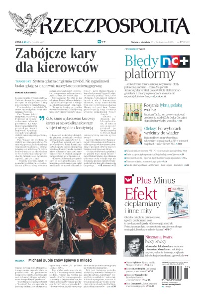 Zabójcze kary dla kierowców – system opłat za drogi znów zawiódł – nie sygnalizował braku opłaty, za to sprawnie naliczył astronomiczną grzywnę; Michael Bublé znów śpiewa o miłości – na jego nowej płycie, której światową premierę zapowiedziano na poniedziałek, są premierowe kompozycje oraz to, co jest specjalnością kanadyjskiego wokalisty: nowe wersje starych przebojów; nieznana twarz lwicy lewicy – Aleksandra Jakubowska o wściekłym antyklerykalizmie, feministycznej farsie i dysfunkcyjnych rodzinach gejowskich; efekt cieplarniany i inne mity – globalne ocieplenie, dziura ozonowa i groźba przeludnienia ziemi to cywilizacyjne legendy, które oswajają nasze lęki.