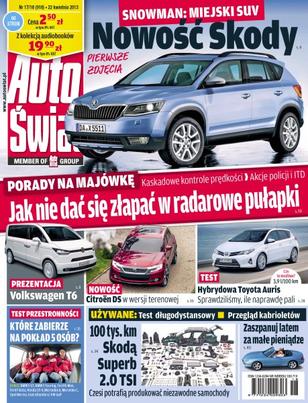 Skoda Snowman – większy SUV z Czech; VW T6 – nowa generacja volkswagenowskiego Transportera; BMW serii 5 GT i kombi, Fordy B-Max i Fiesta, Honda CR-V, Mercedesy klas A i C, Opel Meriva, Seat Alhambra i VW Golf – szukamy auta, w którym zmieści się 5 dorosłych osób z bagażem; Toyota Auris Hybrid – dla kogo samochód z napędem hybrydowym; Volvo XC60 – podrasowane przez Polestara D5 Summum; Skoda Superb Combi – test na dystansie 100 tys. km; naprawa zamiast wymiany – które podzespoły można zregenerować i ile dzięki temu się zaoszczędzi; airbagi dla motocyklistów – sposoby na zwiększenie bezpieczeństwa; radarowe pułapki – jakie niespodzianki czekają nas podczas majówkowych podróży; BMW M – siedem „emek” na torze wyścigowym – auto-fascynacje.