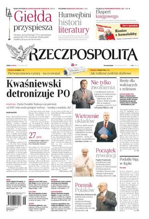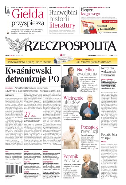 Doradcy prezydenta chcą, by żyjący w biedzie dawni działacze opozycji dostawali specjalne zasiłki; Europa Plus z Kaliszem ma prawie dwukrotnie więcej zwolenników niż z Palikotem; rzecznik praw obywatelskich ponagla MEN, by zajęło się kosztownymi dla rodziców praktykami szkół i wydawców; Władysław Bartoszewski domaga się pomnika w Berlinie wyłącznie dla polskich ofiar zbrodni niemieckich; nowa rada kardynalska pomoże w zreformowaniu krytykowanej Kurii Rzymskiej; połowa kwietnia to czas gry w Monte Carlo, czyli blichtr, tradycja i dużo potu wylanego na czerwoną mączkę; po błędzie sędziego Legia pokonała w Krakowie Wisłę 2:1 i ciągle ucieka – z wyścigu odpadł Górnik, przegrywając u siebie z Podbeskidziem 0:1.