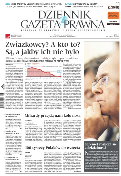 W Polsce do związków zawodowych należy już tylko 15 proc. zatrudnionych – inni nie widzą sensu, bo syndykaty nie mają już na nic wpływu; w ciągu sześciu miesięcy inflacja zmalała o 2,4 pkt proc., by w marcu wynieść już 1 proc. w skali roku; z unijnych 20 mld zł na inwestycje kolejowe na lata 2007–2013 może przepaść od 4 do 5 mld zł; w przyszłym roku żołnierze nie dostaną podwyżek – za to kontraktowi mogą liczyć na wydłużenie służby, o co od dłuższego czasu walczyli; w miarę jak poprawiają się perspektywy gospodarki USA, złoto przestaje być atrakcyjne; banki, firmy telekomunikacyjne i organizacje płatnicze ruszają do boju o portfele Polaków; najnowsze sprawozdanie prokuratora generalnego potwierdza dysproporcje w obciążeniu prokuratorów.