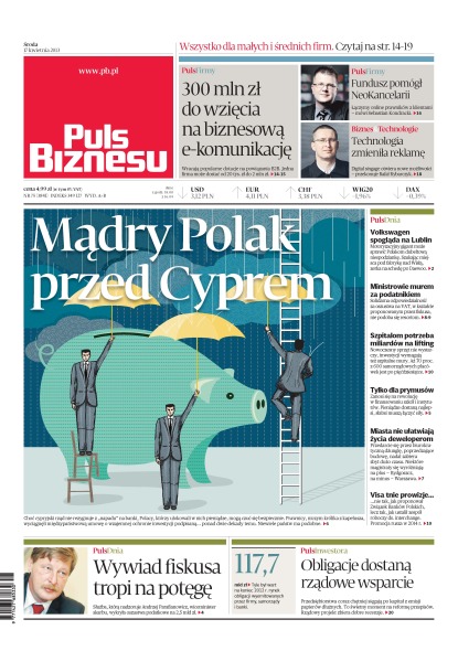 Wracają popularne dotacje na powiązania B2B; choć cypryjski rząd nie rezygnuje z „napadu” na banki, Polacy, którzy ulokowali w nich pieniądze, mogą czuć się bezpiecznie; Volkswagen Volkswagen spogląda na Lublin; solidarna odpowiedzialność za oszustwa na VAT, w kształcie proponowanym przez fiskusa, nie podoba się resortom; dlaczego szpitalom potrzeba miliardów na lifting; zanosi się na rewolucję w finansowaniu szkół i instytutów; miasta nie ułatwiają życia deweloperom; przedsiębiorstwa coraz chętniej sięgają po kapitał z emisji papierów dłużnych; służba, którą nadzoruje Andrzej Parafianowicz, wiceminister skarbu, wykryła oszustwa podatkowe na 2,5 mld zł.
