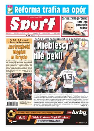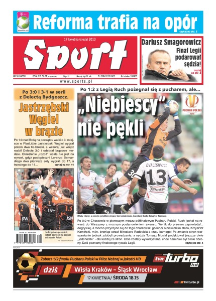 Nie ma praktycznie żadnych szans, by w tym roku oddano do użytku obiekt przy Roosevelta; dziś nad planowaną zmianą formuły rozgrywek pochylić się ma Zarząd PZPN, konstruując kalendarz na sezon 2013/14; po wczorajszym rozstrzygnięciu w Warszawie, już sam awans do finału Wisły lub Śląska może zapewnić przepustkę do Europy; tydzień po śmierci Margaret Thatcher, która wydała wojnę stadionowym chuliganom w Anglii, na trybunach Wembley doszło do zamieszek nieoglądanych od przeszło 20 lat; Jastrzębianie po dwóch latach powrócili na podium i tym samym – najprawdopodobniej – zdobyli przepustkę do eliminacji Ligi Mistrzów; Jerzy Janowicz już się pożegnał z Monte Carlo.